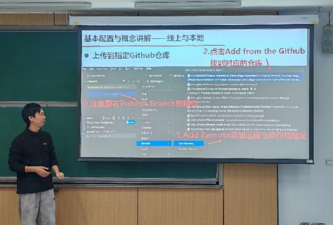 在深入讲解中,彭振邦同学还详细介绍了Git与GitHub的远程协同与备份机制。他通过现场演示,展示了如何安全高效地将本地仓库推送至远程仓库,实现多终端同步与数据双重备份。针对科研团队常见的分支合并与冲突问题,他结合自身经验,讲解了版本回溯、协作审核等实用技巧,帮助同学们更好地理解开源协作的工作流程与学术项目的规范管理方式。